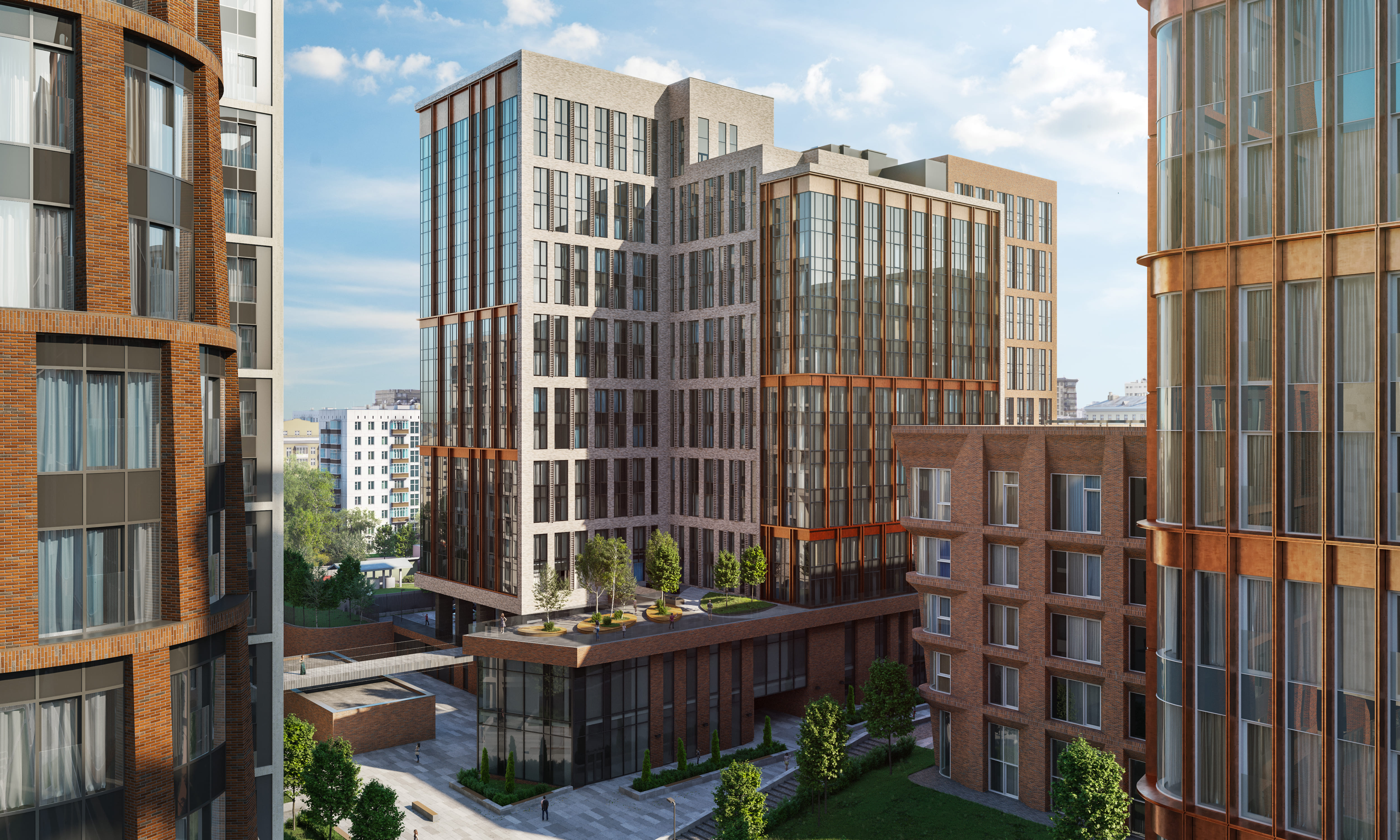 На территории внутреннего двора создана удобная инфраструктура с разнообразными зонами для всех: прогуляйтесь по зелёным аллеям с арками, устройте незабываемую вечеринку у бассейна или наслаждайтесь активным отдыхом с семьёй на свежем воздухе.